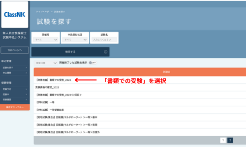 書類受験の場合、「試験を探す >【身体検査】書類での受験」をクリックしてください。(STEP1.1.③参考)