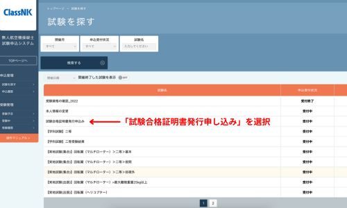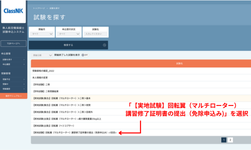 修了審査に合格後、受講生様に電子化された「無人航空機講習修了証明書」(STEP2.1.1参照)を送付 させていただきます。受理後、ClassNKにログインしていただき、「試験を探す >【実地試験】回転翼(マルチローター)講習修了証明書の提出(免除申込み)」をクリックしていただき、実地試験の免除の申請をしていただきますお願いいたします。(STEP2.1.2参照)